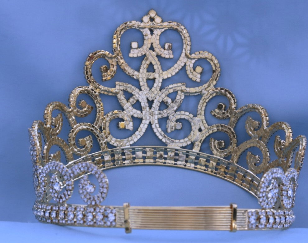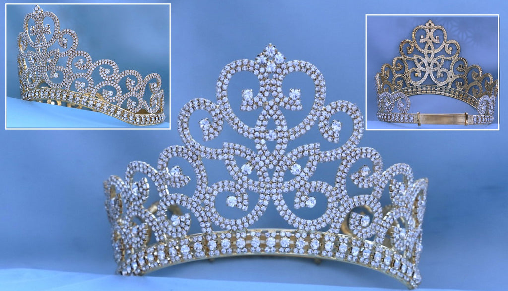 Luxurious rhinestone gold contoured crown with imported Austrian clear crystals. The adjustable crown headpiece can be worn for bridal, pageant, queen, princess and sweet sixteen events, making it the perfect accessory to add a regal touch to any special occasion.