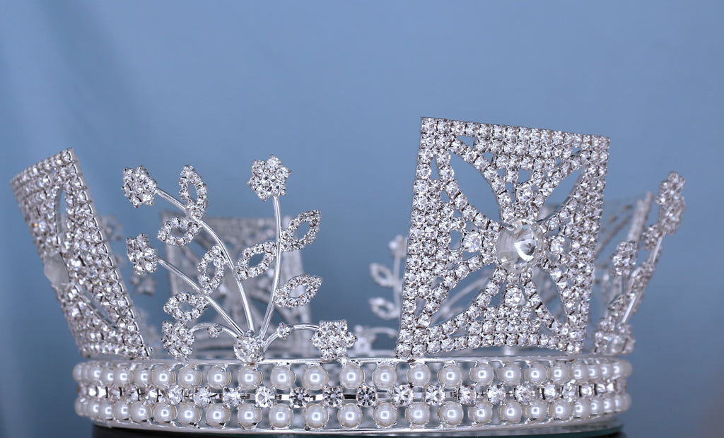 George IV State Diadem "Elizabeth II wore the George IV State Diadem (as Victoria also had in 1838) on her way to the Coronation. It was made in 1820 for George IV Coronation to encircle his Cap of Estate. The diadem incorporates national symbols: roses, shamrocks, and thistles. "This Gorgeous Full Round Crown graceful design historical, This crown very hard to find, suitable for Beauty Pageant, Crown collector, display to your home, Bridal, Opera, paraphernalia, Fancy party The Crown made by First Class Rhinestone with Olivet pearl.